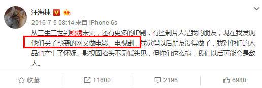 但编剧汪海林却直言:“现在看情况,各影视制作公司对此根本无所谓,因为没人受到惩罚。在文学评估阶段,他们可能就会评估维权成本,成本基本为零。”