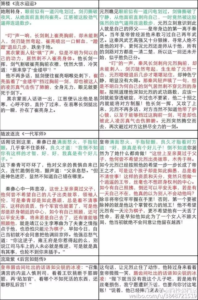 百名热心网友花了3年时间对比,认定《锦绣未央》一共抄了209本书,全书270万字294章,仅9章未抄。框架抄《长歌天下》;女主人设抄《身历六帝宠不衰》等;谋权宫斗模式抄《帝王业》《军师联盟》等。不少细节描写,也直接从别处“拿来”很多内容几乎一字不改。