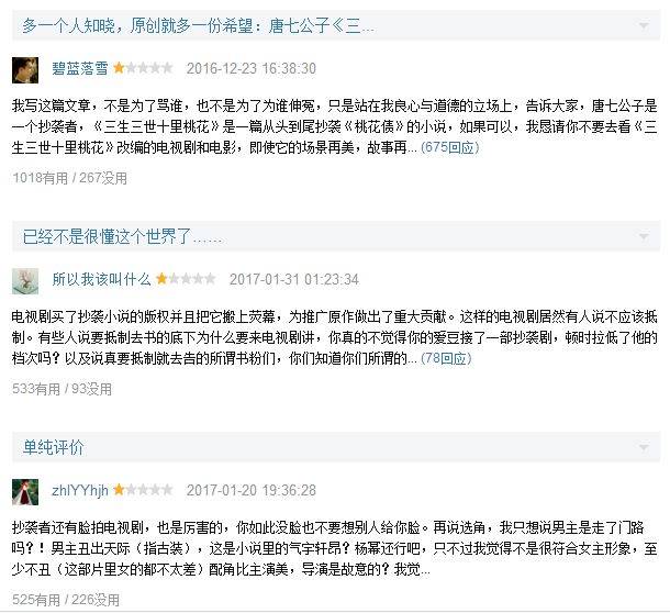 《三生三世十里桃花》自开播第一天起,就有网友号召抵制影视作品,豆瓣评分也多是因涉嫌抄袭而打出的一星。然而该剧除了评分好像并没有受到太大影响,目前网播量已达20多亿。