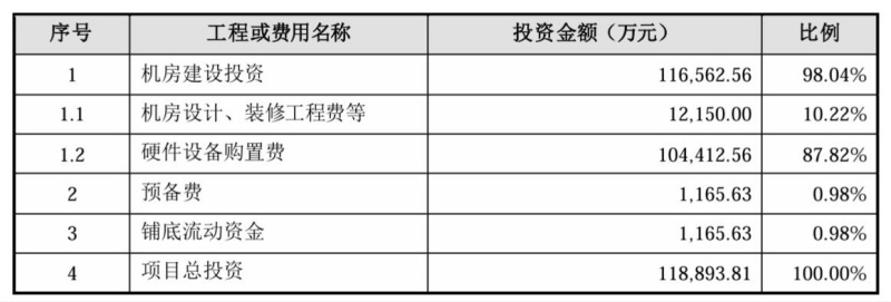 不过,该项目计划总投资达11.89亿元,本次计划投入的募集资金只是总投资额的一半左右。该项目的投资内容包括机房设计、装修工程费、硬件设备购置、预备费、铺底流动资金等,其中,硬件设备购置费将超过10亿元,占总投资的87.82%。奥飞数据并没有具体披露对该项目的经济效益估算情况。