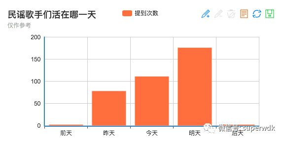 看得出,民谣歌手是在往前看的,至少是活在当下的,「明天」这个词在歌词中出现的次数最多,接着是「今天」和「昨天」,而「前天」和「后天」则几乎可以忽略不计,这也是可以理解的,比如说「我拿青春赌明天」,这听上去很美好,如果要说「我拿青春赌后天」乃至于「我拿青春赌下个月5号」,这听上去就像一个赌徒发疯了。