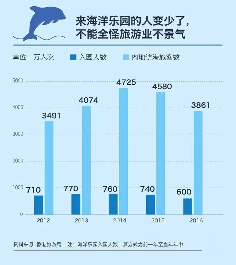 但是,受市场环境和内地游客锐减影响,在2016年,香港海洋公园却经营惨淡,交出了一份自1987年独立运营30年以来最差的答卷。海洋公园的困境,背后是香港旅游业整体进入寒冬的缩影。