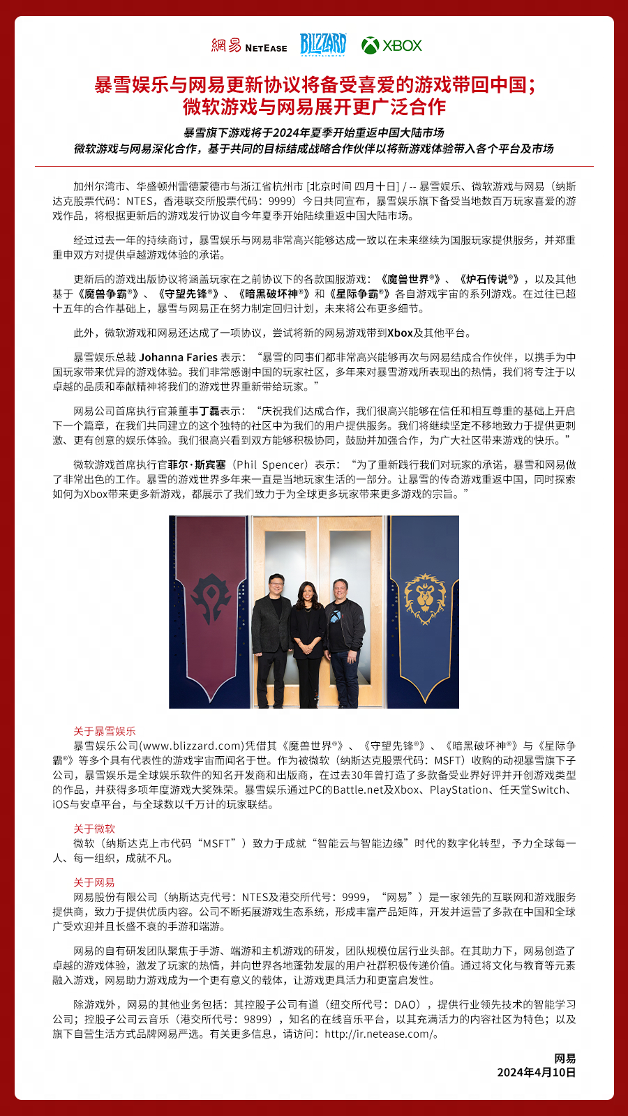 4月10日消息,网易游戏微博官宣,暴雪旗下游戏将于2024年夏季重返中国大陆市场。