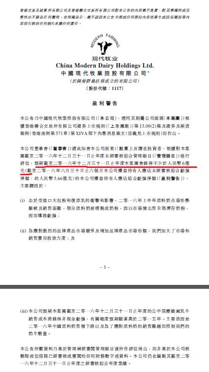 2月6日,现代牧业(01117.HK)发布盈利警告,根据对公司截至2016年12月31日止年度未经审核综合管理账目进行评估,预期截止2016年12月31止年度,公司将录得不少于人民币6亿元的本公司权益持有人应占综合亏损净额。