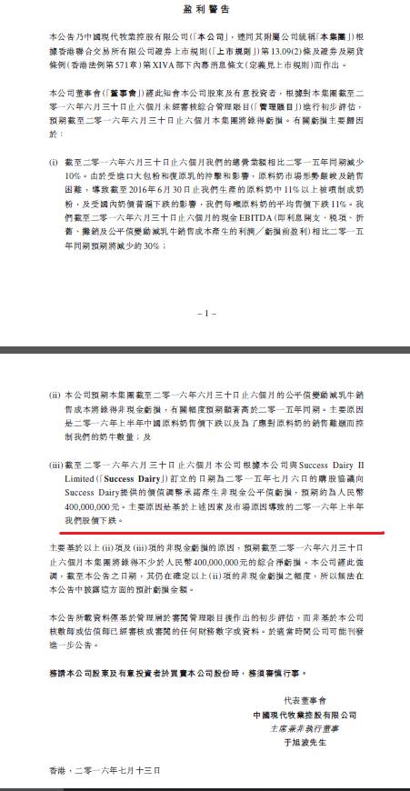 3、截止2016年6月30日止6个月,现代牧业与Success Dairy II Limited(下称“Success Dairy”)订立的日期为2015年7月6日的购股协议(业界称之为“对赌协议”),向Success Dairy提供的价值调整承诺产生非现金公平价亏损,预期约为人民币4亿元。