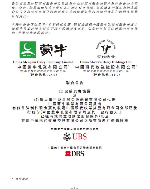 紧随买卖协议完成后,蒙牛及其一致行动人士实益拥有合共23.13亿股现代牧业股份,占现代牧业已发行股本约37.7%。