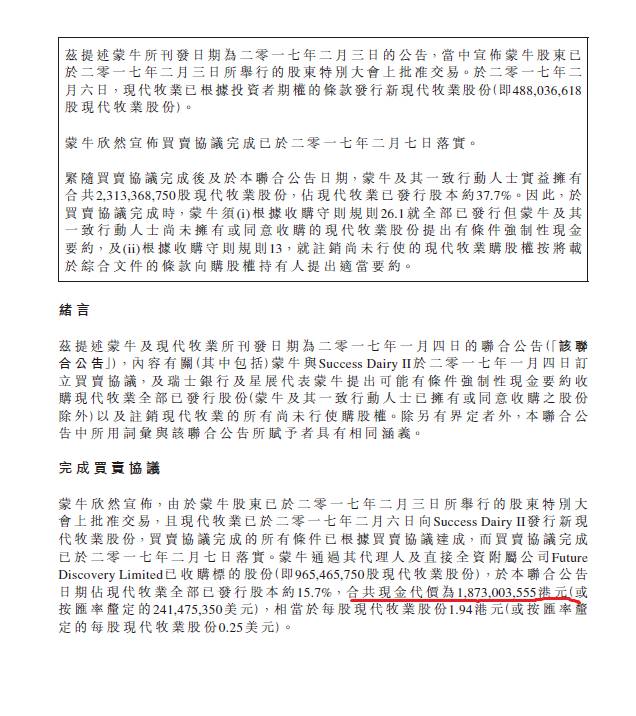 蒙牛联合现代牧业宣布,买卖协议已于2017年2月7日完成落实,即通过代理人及直接全资附属Future Discovery Limited向Success Dairy II完成收购约9.65亿股现代牧业股份,作价18.73亿港元。