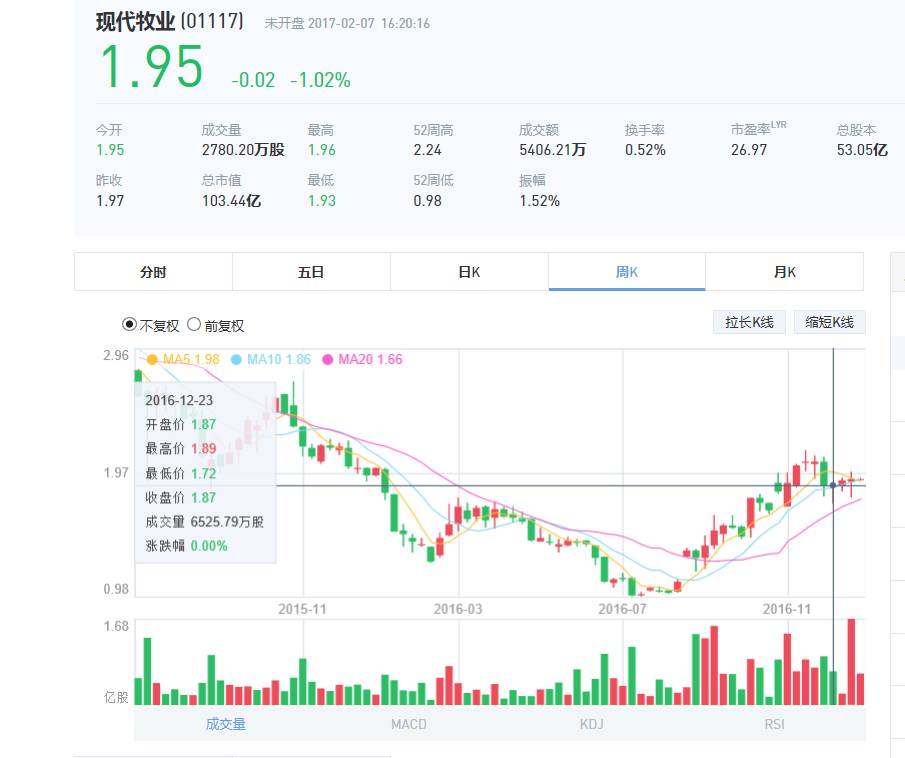 然而,2016年底以及目前,现代牧业股价已经回升,在1.9港元/股左右,相较于2016年7月低谷之时(1港元/股左右),涨幅已经几乎翻番。