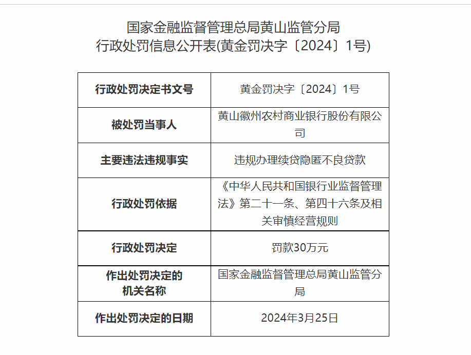 据国家金融监督管理总局安徽监管局官网消息,黄山徽州农村商业银行股份有限公司因违规办理续贷隐匿不良贷款,违反了《中华人民共和国银行业监督管理法》第二十一条、第四十六条及相关审慎经营规则,被国家金融监督管理总局黄山监管分局罚款30万元。