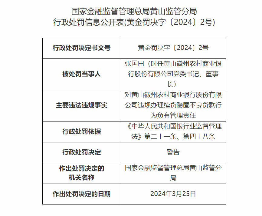 同时,时任黄山徽州农村商业银行股份有限公司党委书记、董事长张国田,因对黄山徽州农村商业银行股份有限公司违规办理续贷隐匿不良贷款行为负有管理责任,被处以警告。