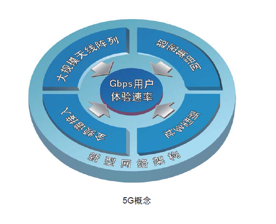 因此,综合5G关键能力与核心技术,5G概念可由“标志性能力指标”和“一组关键技术”来共同定义。其中,标志性能力指标为“Gbps用户体验速率”,一组关键技术包括大规模天线阵列、超密集组网、新型多址、全频谱接入和新型网络架构。