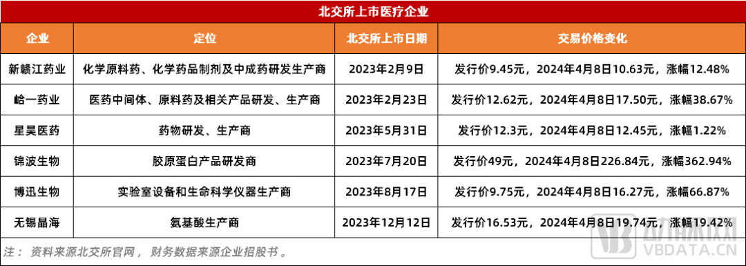 事实上,北交所当前已经有不少成功案例,包括锦波生物、星昊医药、博迅生物、无锡晶海、峆一药业、新赣江药业等医疗企业均是在2023年在北交所成功上市,并且其股价均呈现涨幅态势,以胶原蛋白产品研发商锦波生物为例,2024年4月8日价格226.84元,较发行价格49元上涨362.93%。这在当下资本寒冬极为难得。