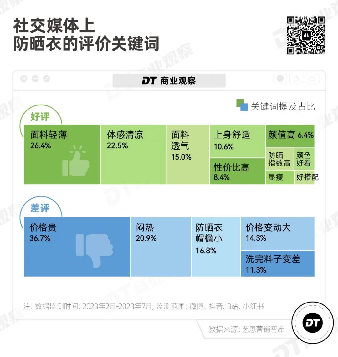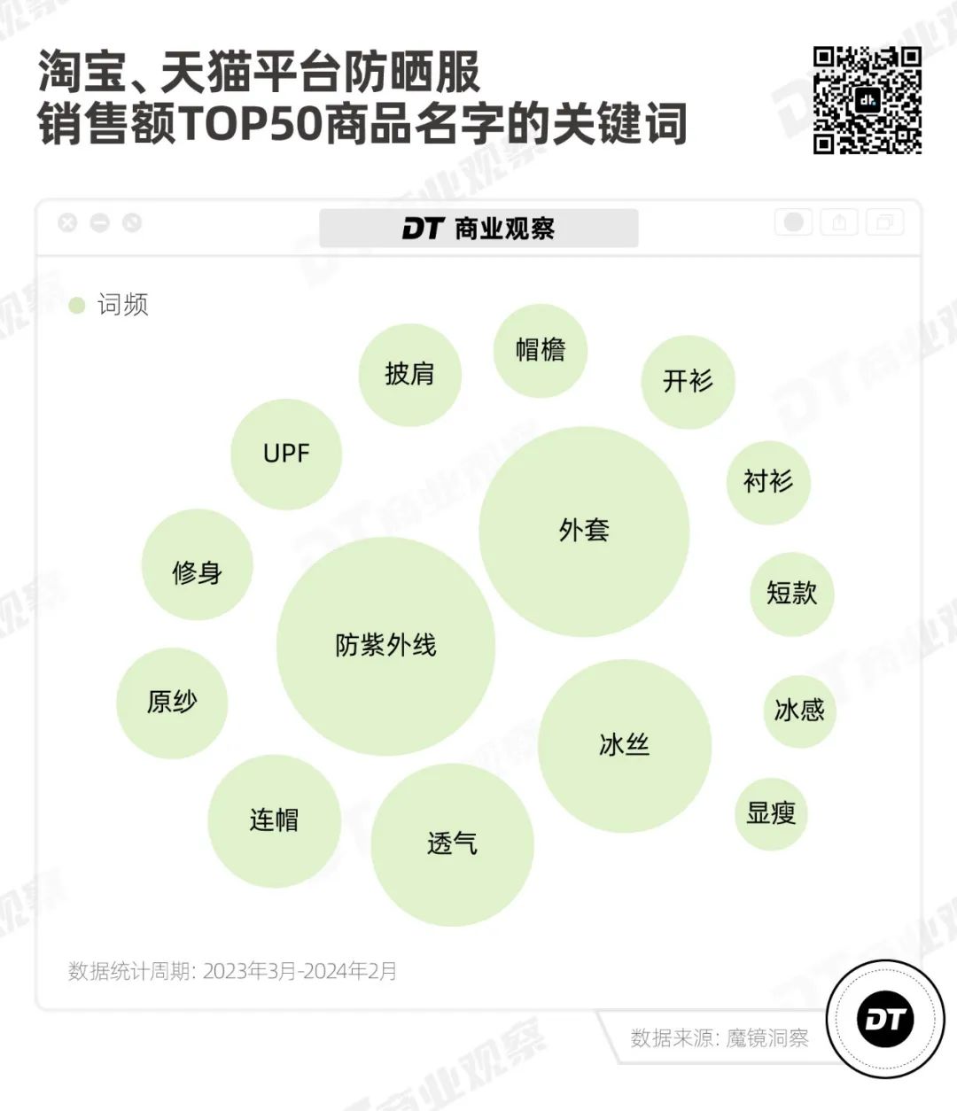 《DT商业观察》先是扒了淘宝天猫平台防晒衣销售额TOP50商品,把商品名字的关键词做了拆分和词频统计,然后查看了微博、小红书等社交媒体上对于防晒衣的好评和差评。