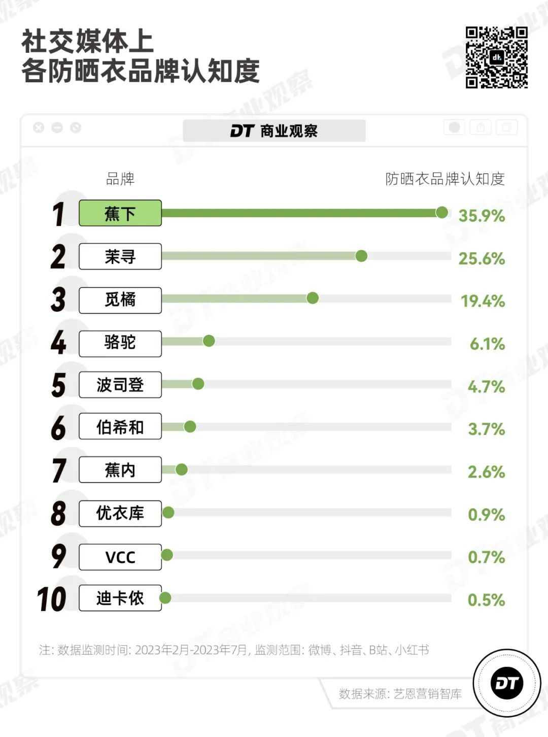 在社交媒体上,蕉下防晒衣认知度排名第一,且明显高于第二名。