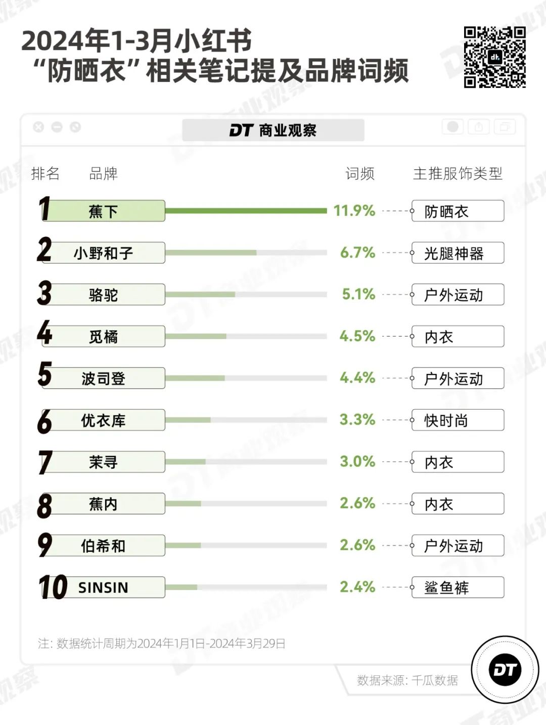 从今年1-3月份小红书上的笔记来看,目前防晒衣市占率第一的蕉下仍然被大众讨论最多,除此之外,还有三类品牌也被多次提及: