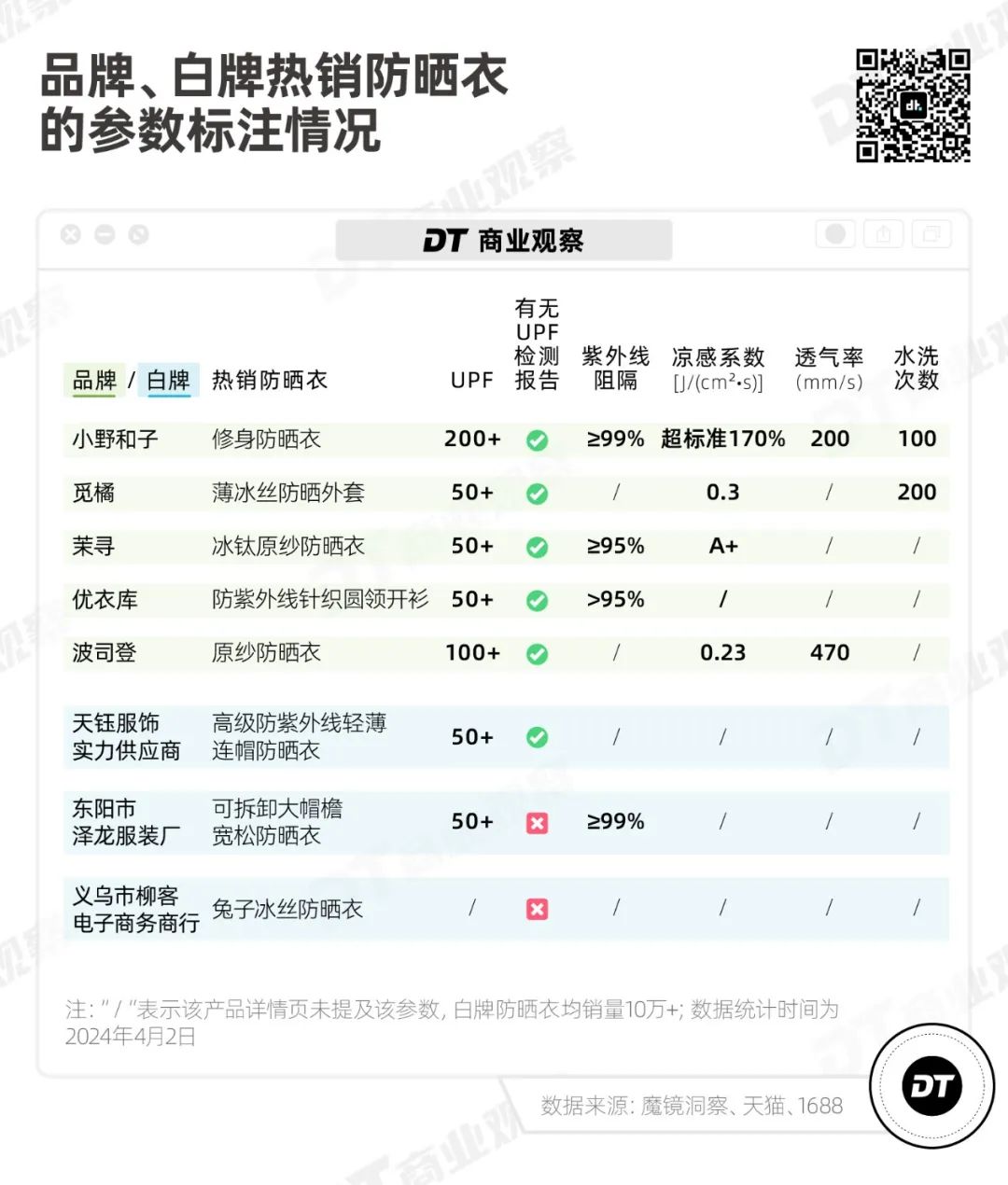 白牌防晒衣的参数标注不太透明,大都是感性描述,比如“可以降温的冰凉体感”。