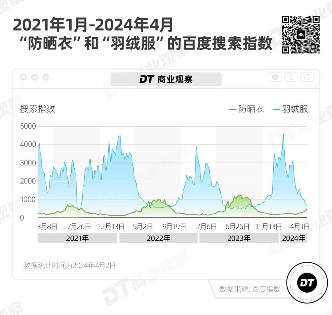 与之呼应的是,从2021年到2023年夏天,防晒衣的百度搜索指数逐年增长,和羽绒服“错峰”登场,形成季节性互补。