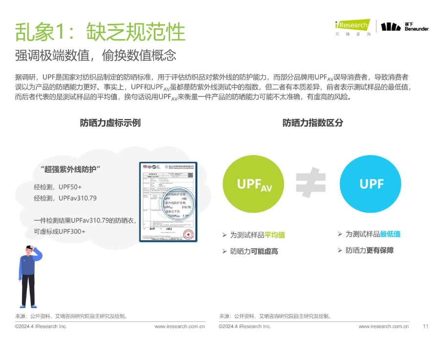 一方面是因为,过高的UPF值很容易是“虚高”,即品牌或白牌把UPFav(测试样品的防晒平均值)说成了UPF(测试样品的防晒最低值),混淆概念。