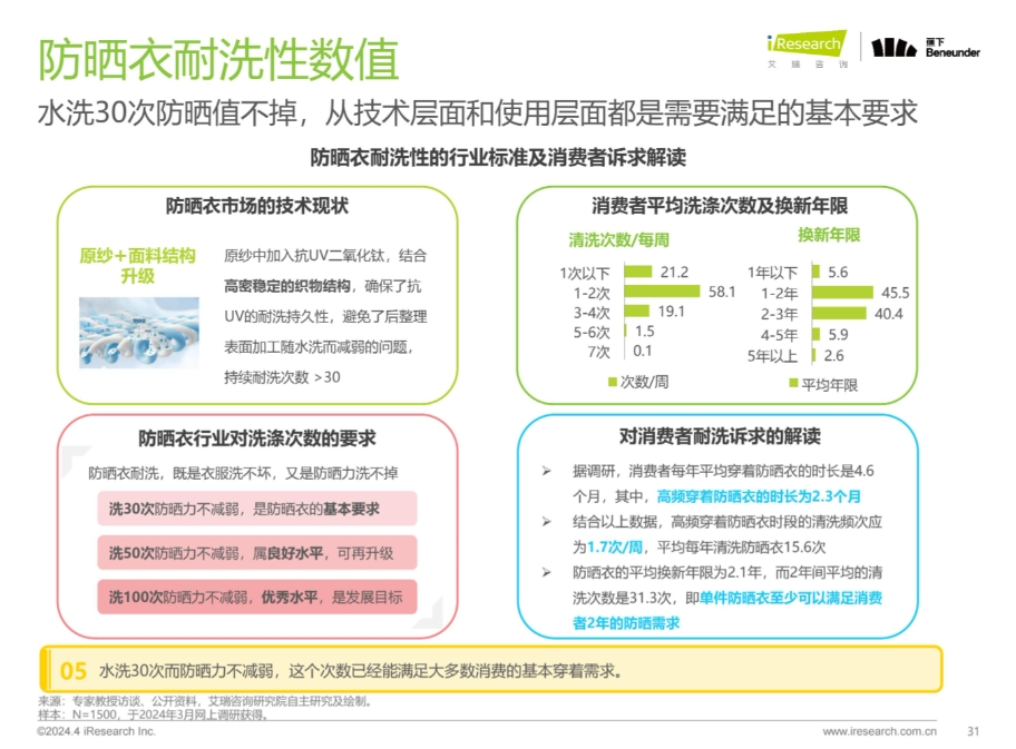 按照平均换新年限为2.1年计算,2年间平均清洗次数为31.3次。如果一件防晒衣可以“洗涤30次不减防晒”,那么基本可以满足消费者2年的防晒需求。