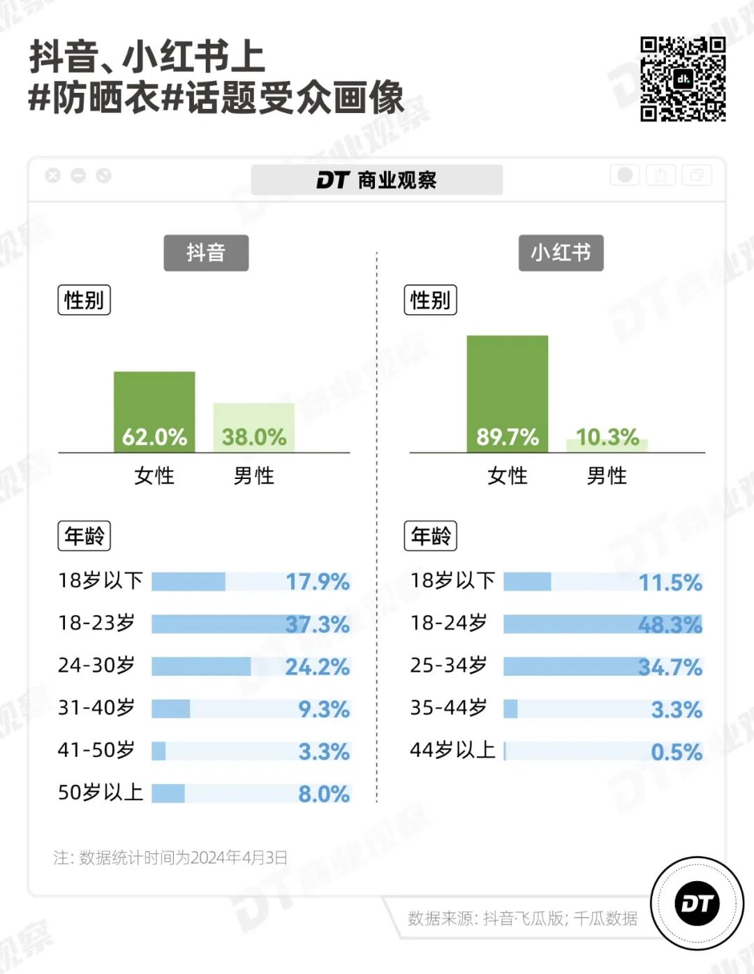 小红书和抖音上,防晒衣相关话题受众覆盖了全年龄段。因为平台本身属性,小红书上关注防晒衣的群体以女性群体为主,但抖音上防晒衣的关注者,男女比例接近4比6。