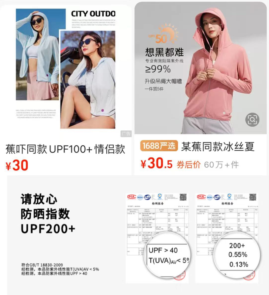 品牌商家大多会在详情页公开UPF检测报告(UPF值,紫外线防护系数,如果UPF>50,意味着1/50的紫外线可以透过织物,可以隔绝98%的紫外线)及凉感、透气率等参数。