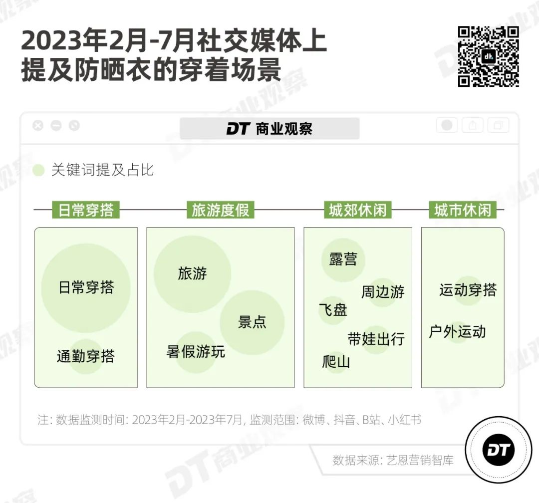 从社交媒体上提及防晒衣的穿着场景来看,防晒衣的穿着场景主要有两类。一种是轻量化的户外场景,如旅游度假、城市休闲活动;还有一种是日常场景,即短时间出门或通勤、办公室等场景。