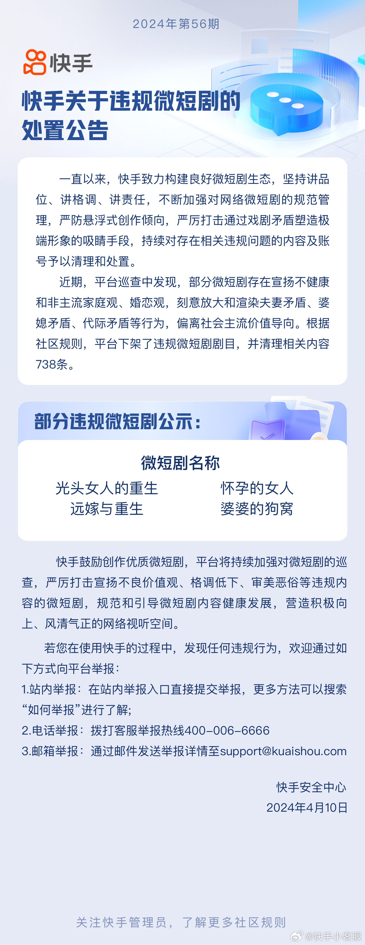 4月10日,快手安全中心发布公告称,近期,平台巡查中发现,部分微短剧存在宣扬不健康和非主流家庭观、婚恋观,刻意放大和渲染夫妻矛盾、婆媳矛盾、代际矛盾等行为,偏离社会主流价值导向。根据社区规则,平台下架了违规微短剧剧目,并清理相关内容738条。部分违规微短剧公示:《光头女人的重生》《怀孕的女人》《远嫁与重生》《婆婆的狗窝》。