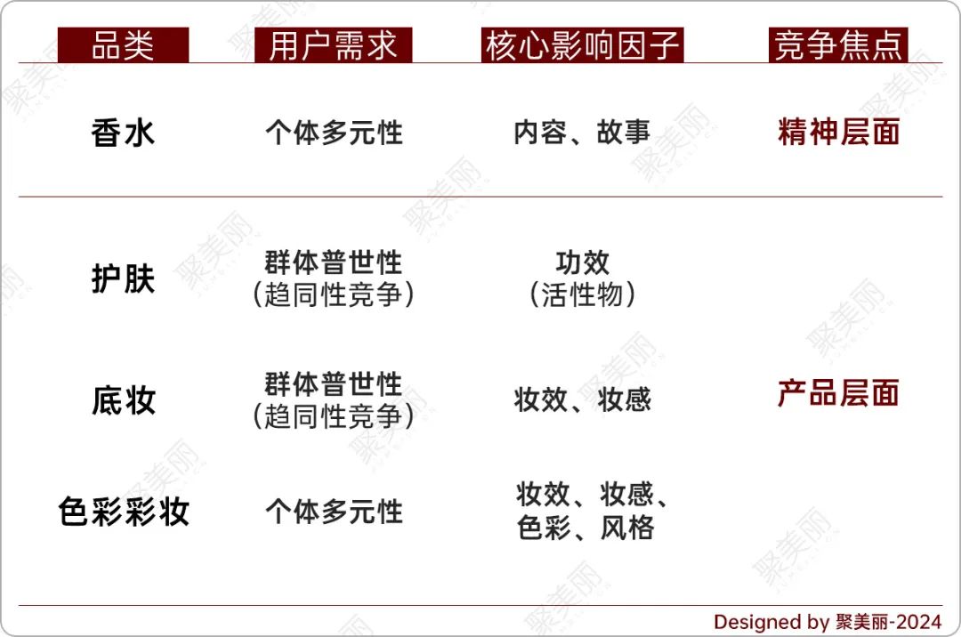 刚说了香水与彩妆品类在发展阶段层面的早期不成熟性,有相似之处,但是我们也知道,从品类的底层属性,两者是有一定区别的。我们把香水与护肤,香水与彩妆做个简单的比较。