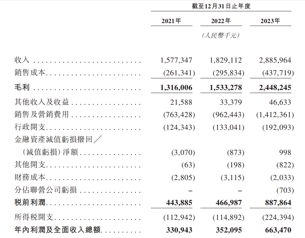 据最新招股书显示,毛戈平总营收从2021年的15.77亿增至2022年18.29亿,并于2023年进一步扩张至28.86亿,2021-2023年的复合年增长率为35.3%;净利润也从2021年的3.31亿,增至2023年的6.64亿,复合年增长率高达41.6%。