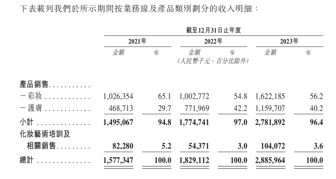 数据显示,毛戈平的护肤营收从2021年的4.69亿,增长至2023年的11.60亿,年复合增长率高达57.3%,而护肤的比例也从29.7%扩张至40.2%;彩妆在去年的营收也达到了16.2亿,占比为56.2%。