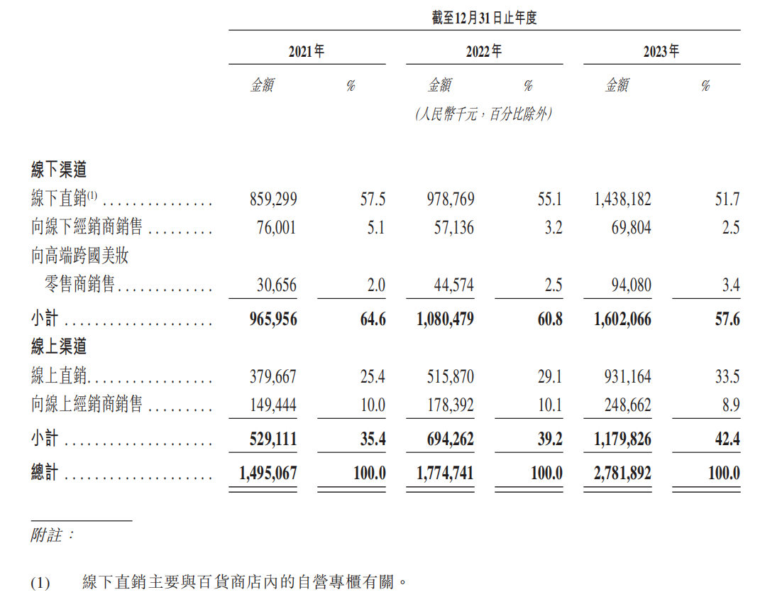 从招股书来看,毛戈平的线上渠道营收从2021年的5.29亿迅速增长至2023年的11.80亿,年复合增长率为49.3%,销售额占比也达到42.40%,与线下渠道平分秋色。