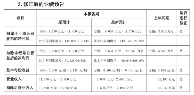 修正前后差距最大的是收入项目,其中,修正之后的营业收入预计为2050万元至2665万元,原预计为11300万元至14000万元;修正之后的扣除后营业收入为1590万元至2065万元,原预计为10800万元至13500万元;修正前后相差约1亿元,且修正后的收入预计不超过3000万元。