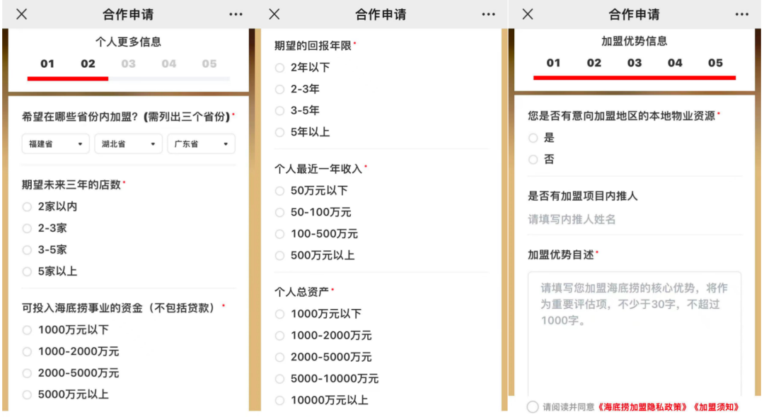 在海底捞加盟商的合作申请报名表中给出了4个选项,分别是1000万元以下,1000-2000万元,2000-5000万元以及5000万元以上(均不包含贷款),且加盟商“需要具备多店发展的基础”。