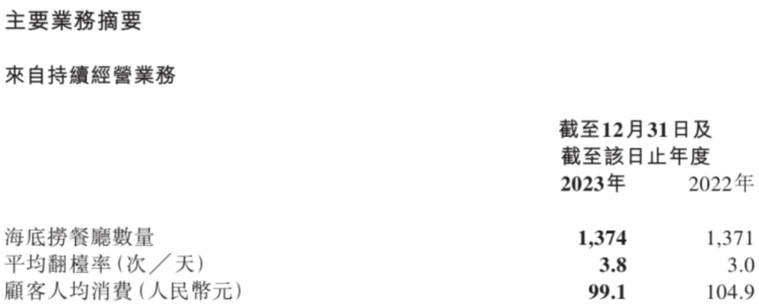 细化到经营数据方面,海底捞2023年餐厅整体翻台率达到了3.8次/天,相较去年同期增长了26.7%。许是受消费分层趋势影响,翻台率攀升的背后,是从2022年的104.9元跌至99.1元的客单价。