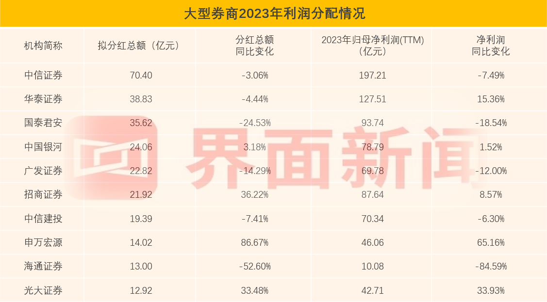 2023年券商业绩承压,相应地,过半大型券商分红金额有所减少。