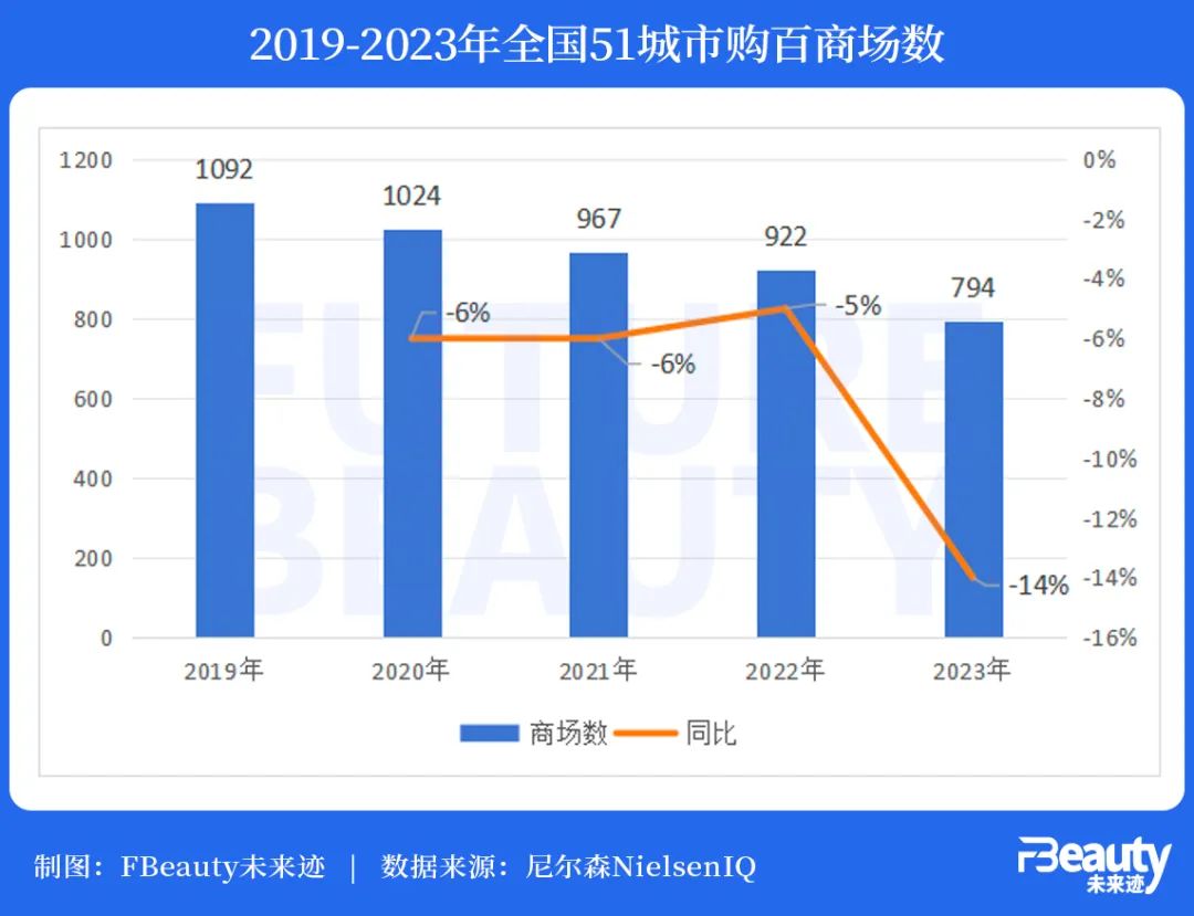 尼尔森NielsenIQ独家提供给《FBeauty未来迹》的数据显示,全国51个城市的百货购物中心化妆品柜台总数,从2019年3月到2023年直接减少了近6000个。