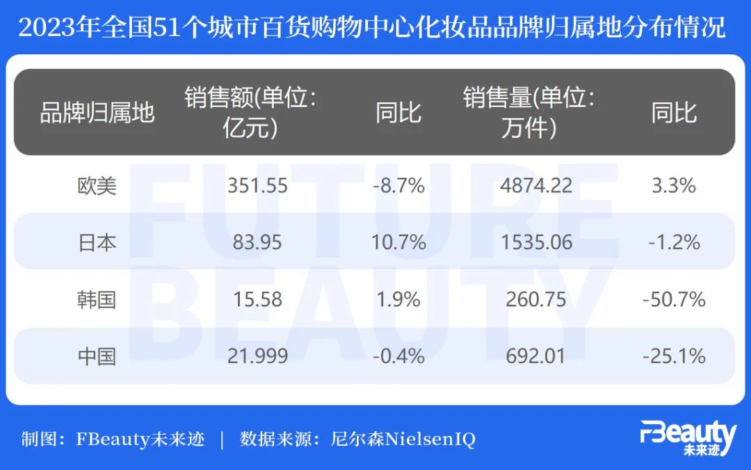 就品牌归属地情况看,尼尔森NielsenIQ数据显示,2023年,全国51个城市百货、购物中心的化妆品销售中,欧美化妆品全年销售额同比下降8.7%至351.55亿元,但依旧占据了市场的绝大多数份额,销售额占比高达74.3%。