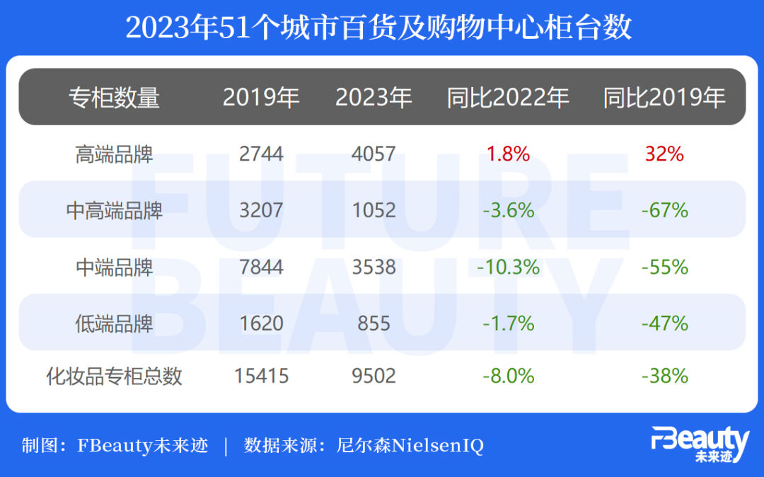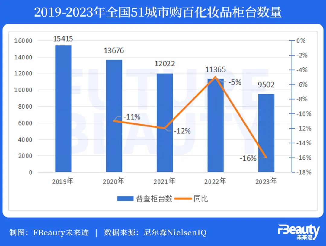 据全球消费者研究与零售监测公司尼尔森NielsenIQ提供给《FBeauty未来迹》的数据,在全国51个城市的百货购物中心中,化妆品柜台总数从2019年3月的15415个减少至2023年的9502个,五年内有近6000个柜台消失不见。