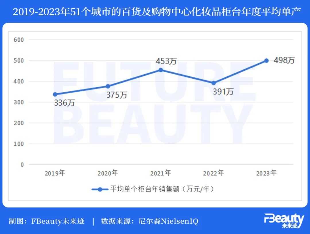 但在如此巨大的数量落差下,去年全国51个城市百货购物中心的化妆品销售额同比2022年仍回暖6%至473亿元,且单个柜台年度产出(销售额)从2019年的近336万,增长至2023年的接近500万元。