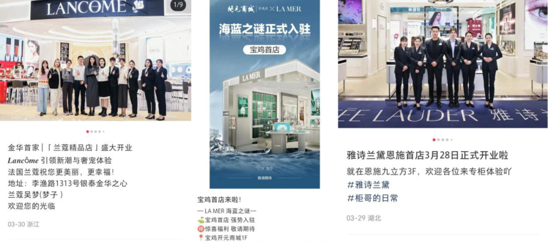 其中,许多商场会打出某品牌“区域首店”的称号扩大宣传,例如宝鸡开元商城开出的海蓝之谜为宝鸡首店、金华之心银泰开出的兰蔻为金华首店、恩施九立方开出的雅诗兰黛为恩施首店,以高端化妆品品牌首店来吸引辐射区域内的消费者。