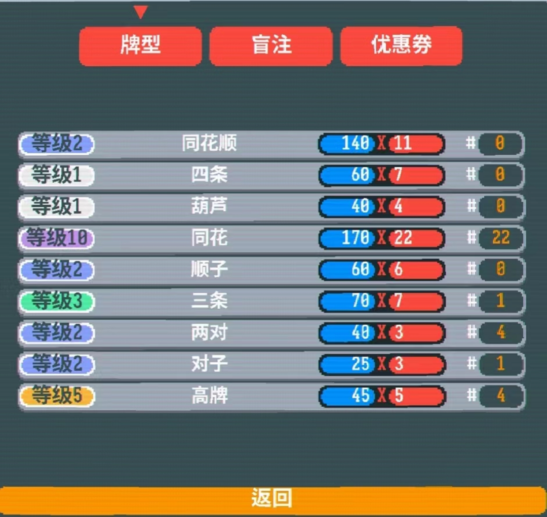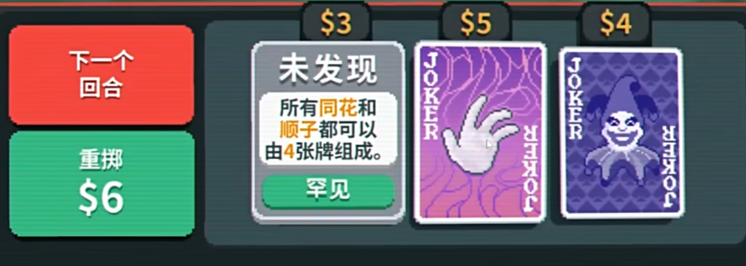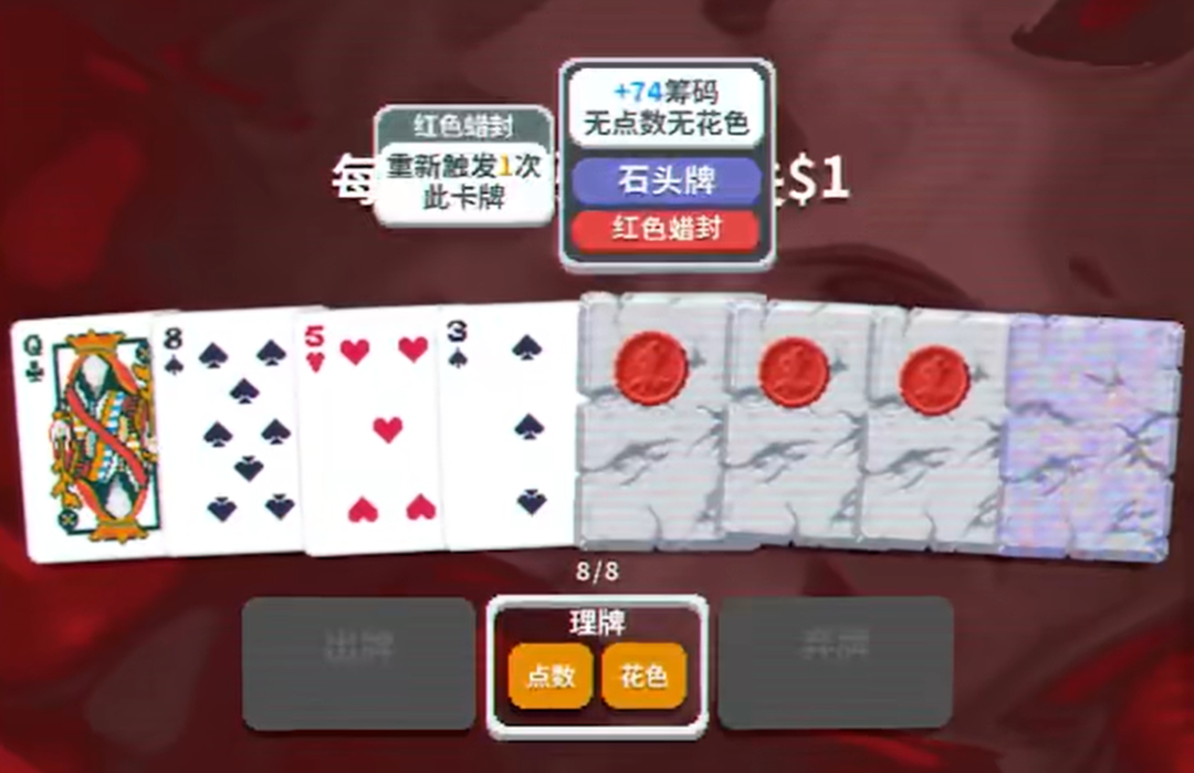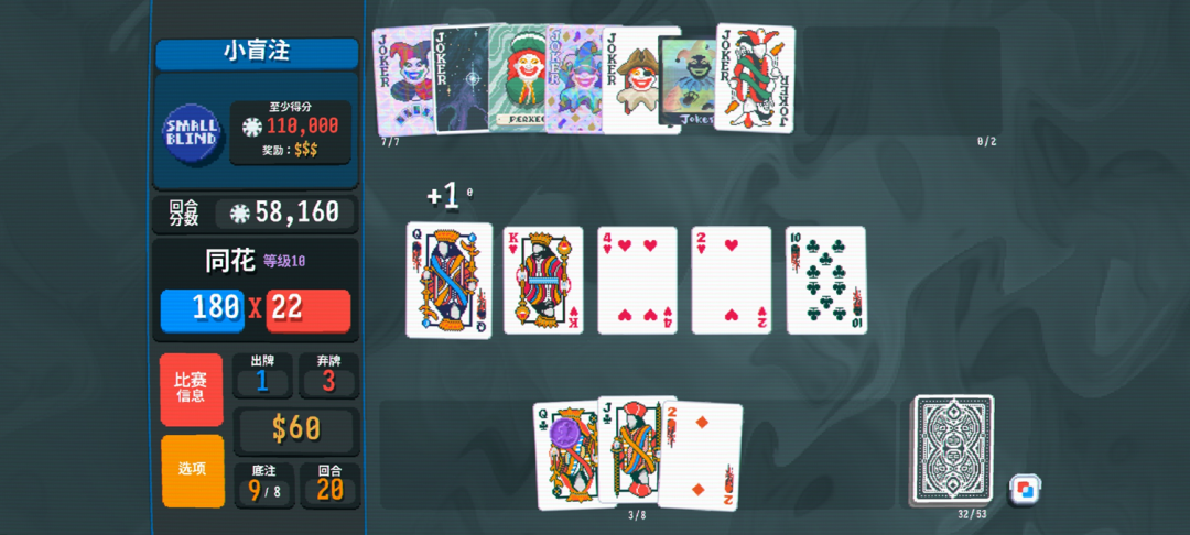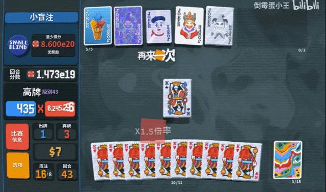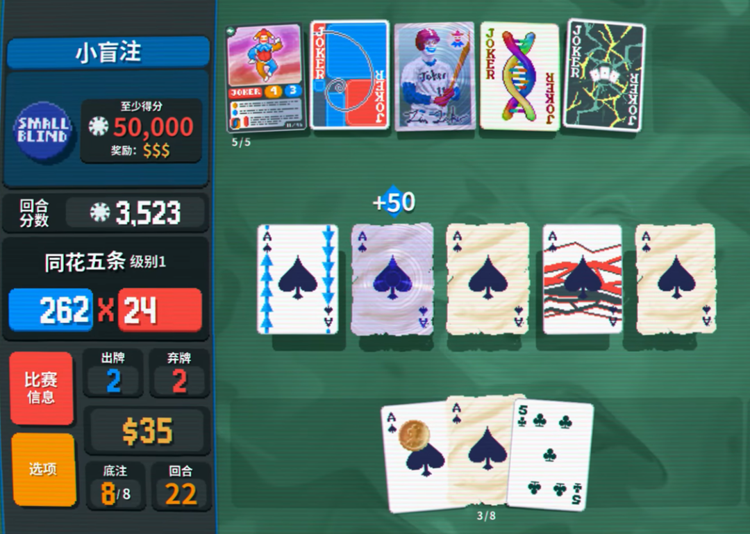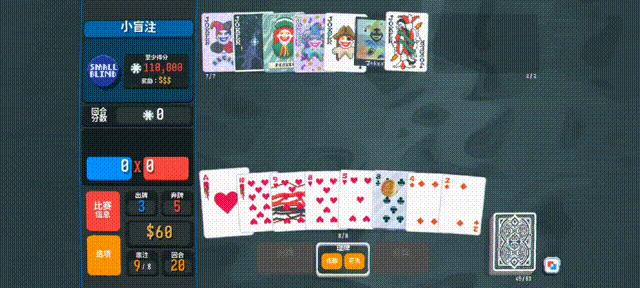《小丑牌》其实也差不多的,通过凑牌型来获得更高的分数,然后达到关卡需要的分数就可以了。