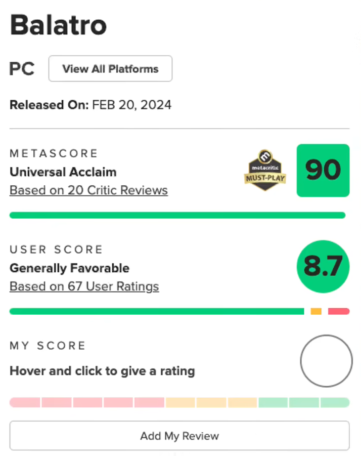 在Steam上,《小丑牌》的在线峰值已经超越了肉鸽卡牌的概念神《杀戮尖塔》,M站的媒体均分也超过了90分,几乎可以说是“贷款”年度最佳游戏设计奖了。
