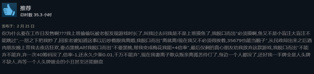 和《致命公司》不同的是,《小丑牌》并不是联机游戏,而且游戏只有60MB 的大小,堪称摸鱼神器。在玩了几天后,本人的精神状况并不比下面这位玩家好上多少: