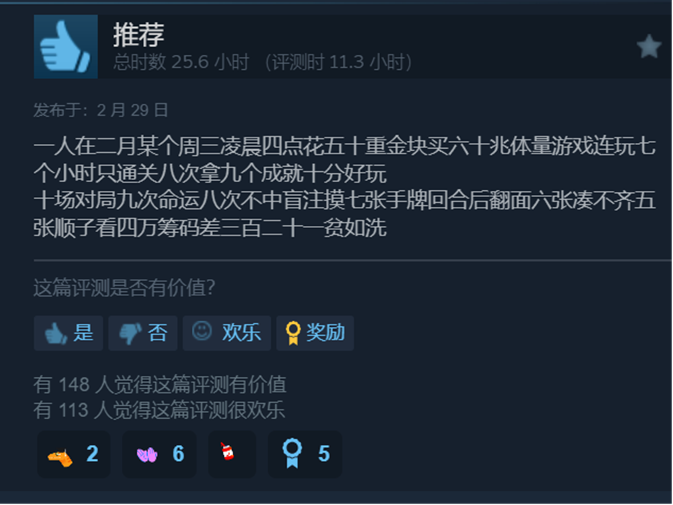 这其实并不意外,游戏包含随机开箱元素,更重要的是小丑牌的存在让玩家的期待值被无限放大,总给人一种能够操纵对局的错觉,而在对局中我们又总是输,这样大起大落的游戏节奏十分容易让人联想到现实赌博。如果更准确一点的话,《小丑牌》的某些设计和行为心理学中的“斯金纳箱”有暗合之处......