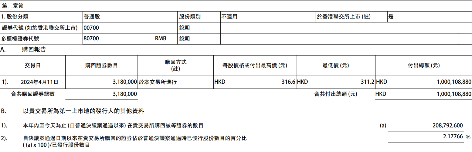 腾讯控股4月11日在港交所公告,公司于4月11日回购318万股股票,回购价格为311.2-316.6港元,共耗资约10亿港元。