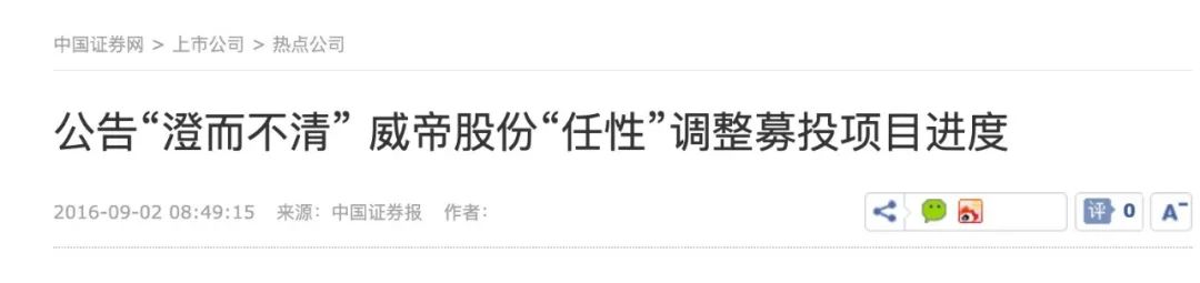 被媒体质疑后威帝股份发布澄清公告,表示将结合实际情况加快募投项目的实施进度,同时表示“对项目实施进度计划做了适当调整”。不过对于进度调整的决定是何时、由谁作出以及新的进度计划,包括对公司生产经营的具体影响都没有披露,被《中国证券报》质疑涉嫌违反交易所对于上市公司募集资金管理办法的相关规定,同时涉嫌违反信披规定。