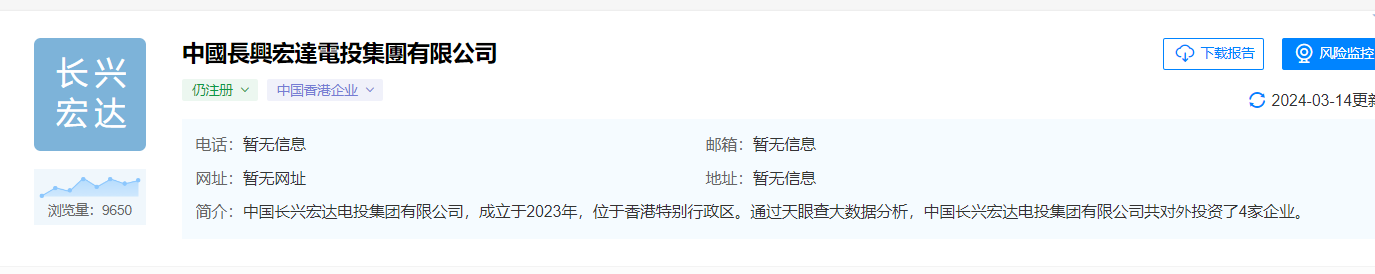 但界面新闻通过天眼查层层追踪,衡南煜盟最终的实际控制人系中国长兴宏达电投有限公司,而后者是香港公司,最终的实际控制人无从查询,且这家公司成立于2023年。