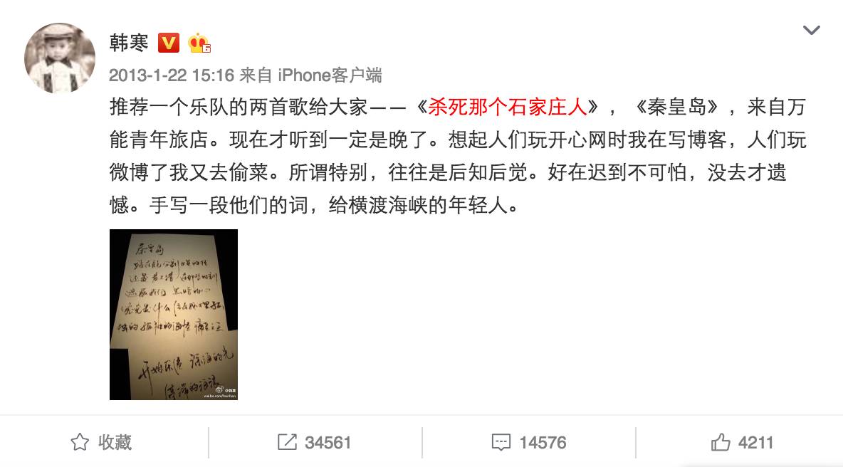 小众媒体的影响力需要不断积累,比如2013年韩寒对于万能青年旅店的推荐就让他们小火了一下。