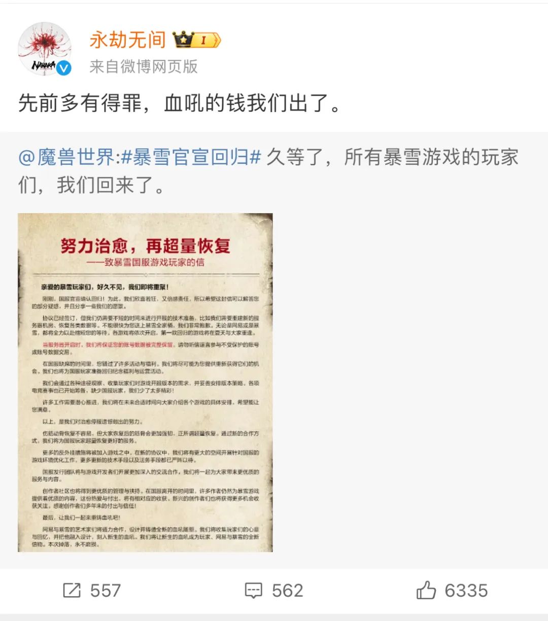 4月10日,作为暴雪最具代表性的游戏《魔兽世界》,发布了一封《致玩家信》,第一时间对这次“复合”做出了回应。