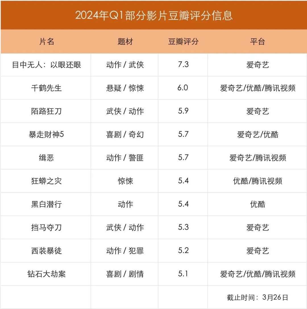据文娱商业观察不完全统计,Q1上新的影片中,豆瓣评分超过5分的达到了10部,这说明头部影片的内容品质依然是在线的。其中武侠动作电影《目中无人:以眼还眼》的评分最高,从开分的7.1分逐渐上涨到3月底的7.3分。